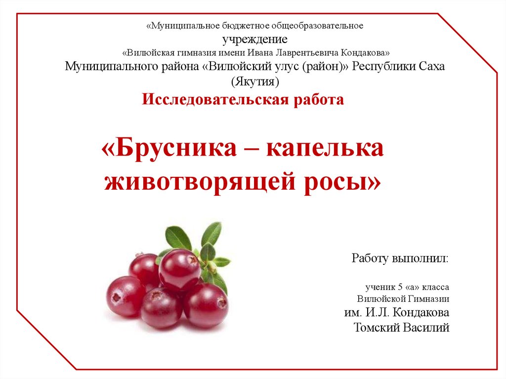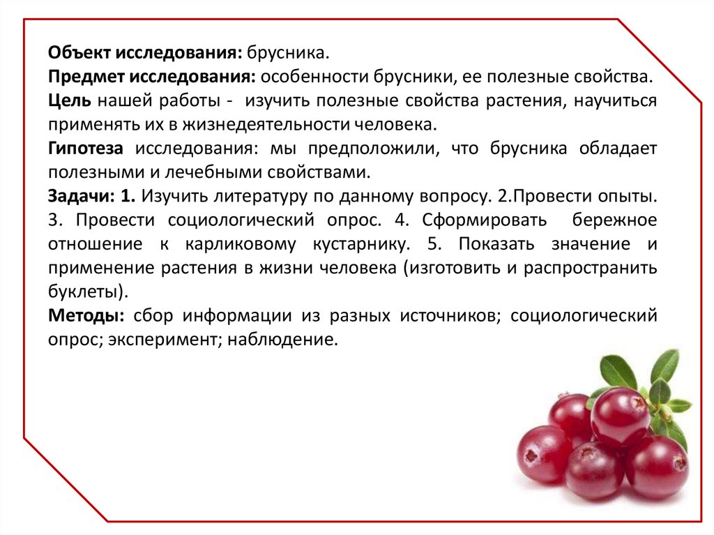 Объект исследования: брусника.Предмет исследования: особенности брусники, ее полезные свойства.