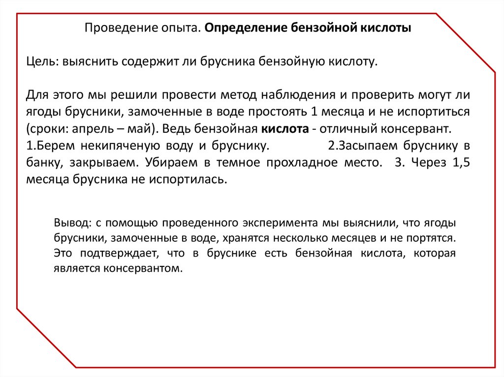 Проведение опыта. Определение бензойной кислотыЦель: выяснить содержит ли брусника бензойную кислоту.