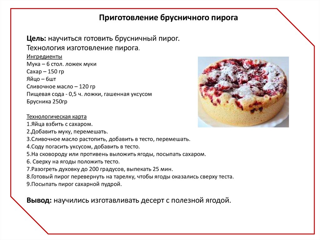 Приготовление брусничного пирогаЦель: научиться готовить брусничный пирог.