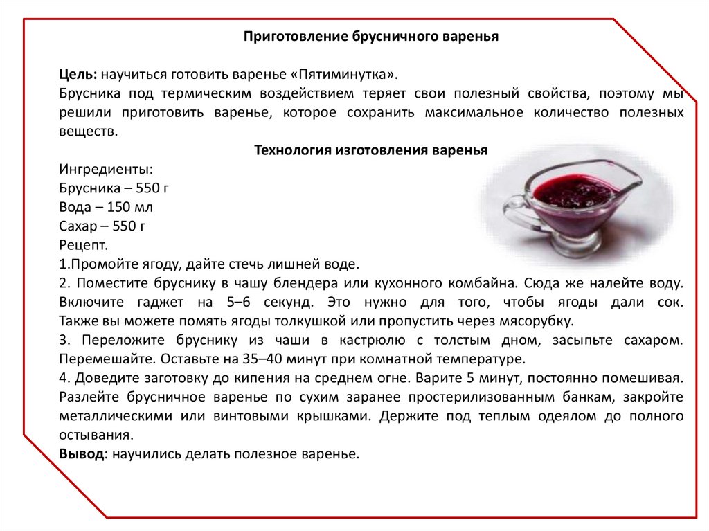 Приготовление брусничного вареньяЦель: научиться готовить варенье «Пятиминутка».