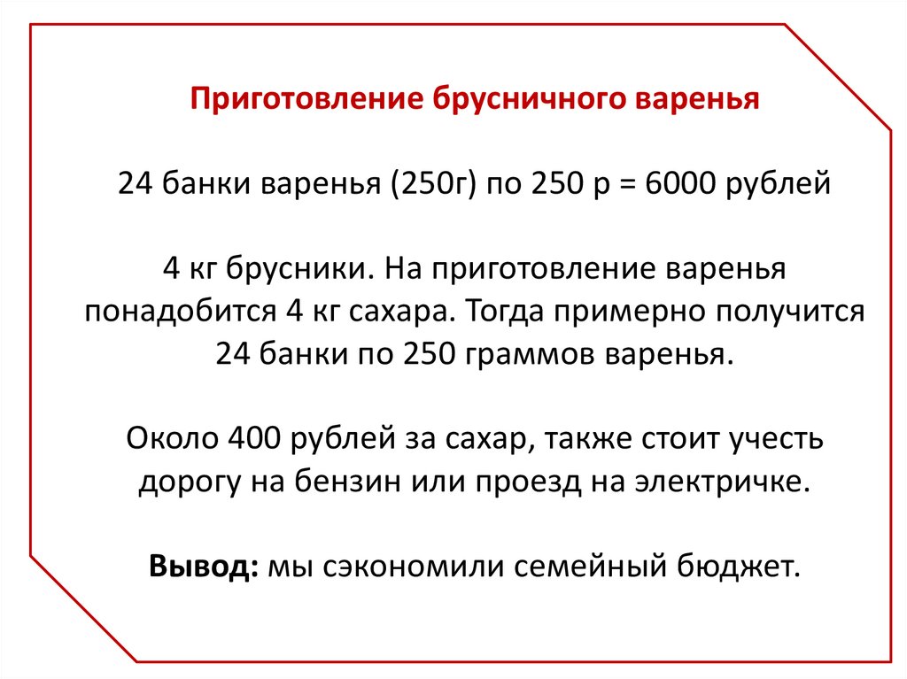 Приготовление брусничного варенья24 банки варенья (250г) по 250 р = 6000 рублей