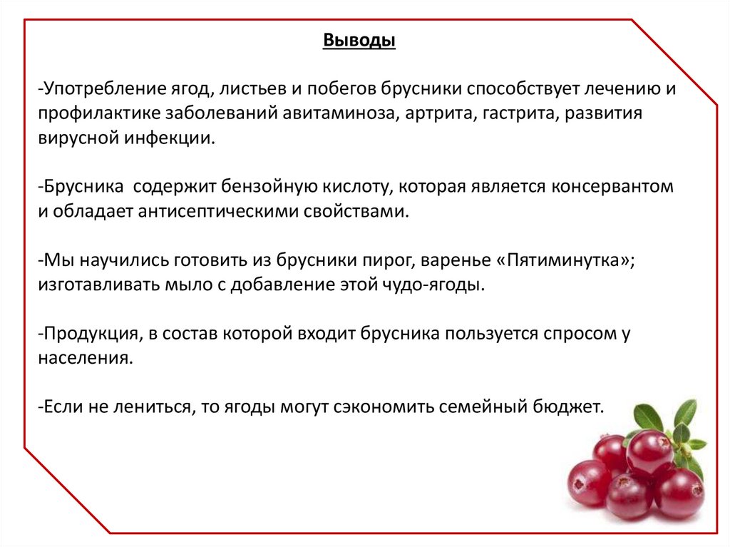Выводы-Употребление ягод, листьев и побегов брусники способствует лечению и