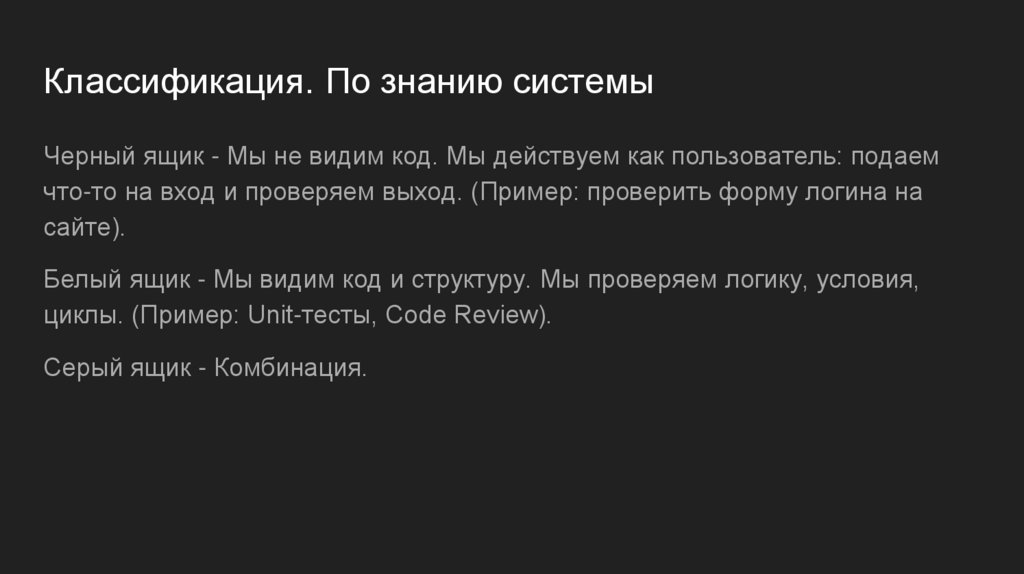 Классификация. По знанию системыЧерный ящик - Мы не видим код. Мы действуем как пользователь: подаем