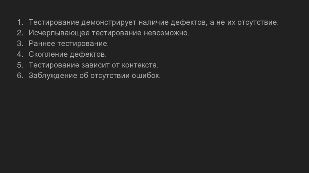 1. Тестирование демонстрирует наличие дефектов, а не их отсутствие.2. Исчерпывающее тестирование невозможно.