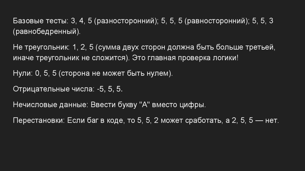 Базовые тесты: 3, 4, 5 (разносторонний); 5, 5, 5 (равносторонний); 5, 5, 3(равнобедренный).