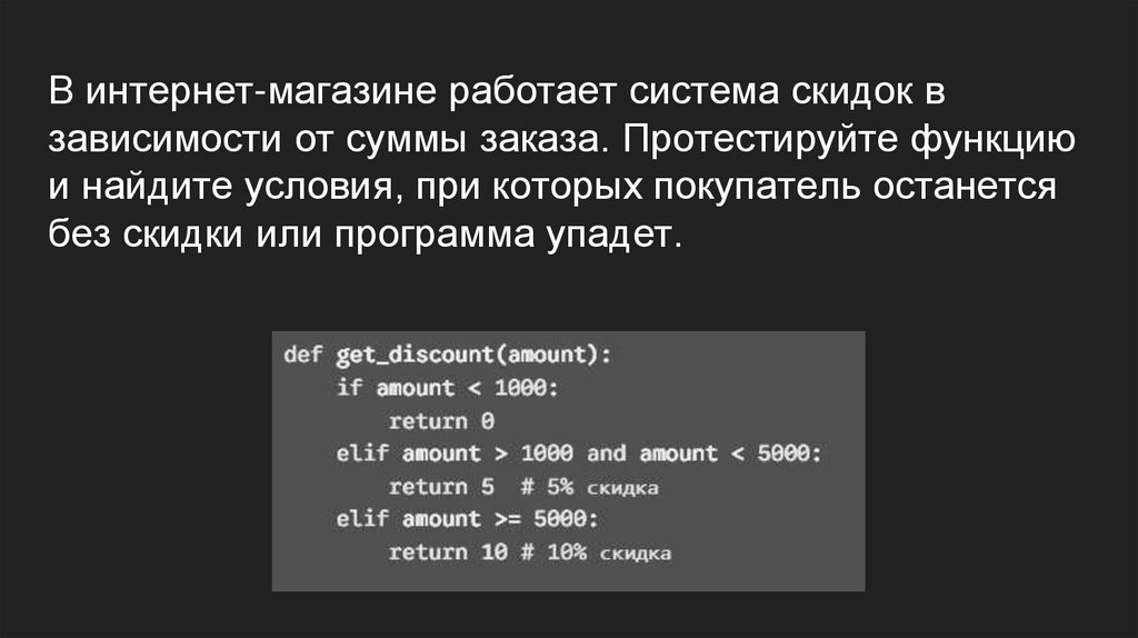 В интернет-магазине работает система скидок взависимости от суммы заказа. Протестируйте функцию