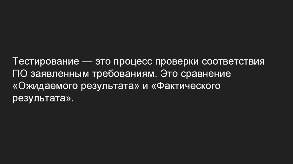 Тестирование — это процесс проверки соответствияПО заявленным требованиям. Это сравнение
