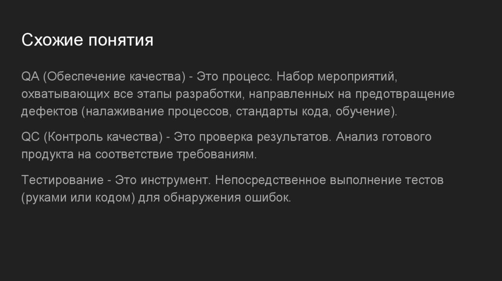 Схожие понятияQA (Обеспечение качества) - Это процесс. Набор мероприятий,