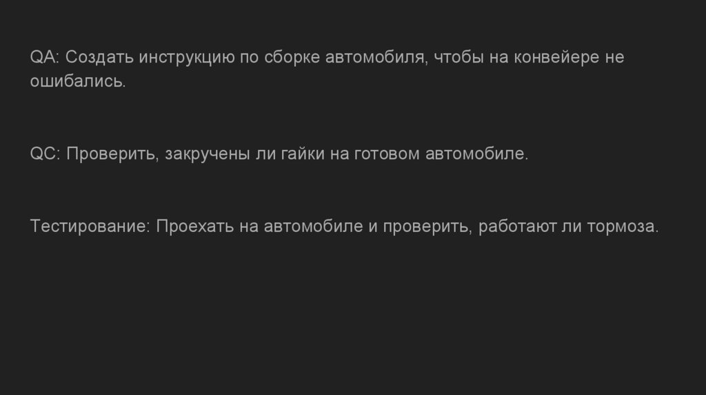 QA: Создать инструкцию по сборке автомобиля, чтобы на конвейере неошибались.