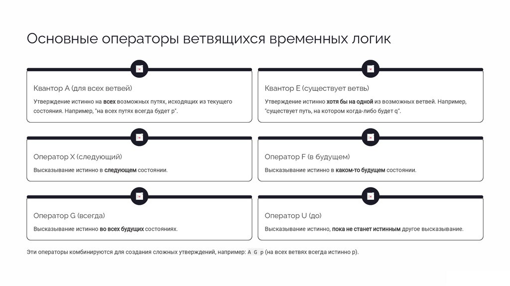 Эти операторы комбинируются для создания сложных утверждений, например: A G p (на всех ветвях всегда истинно p).