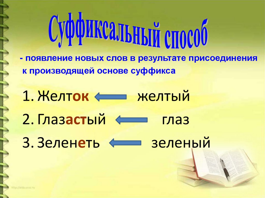 - появление новых слов в результате присоединенияк производящей основе суффикса