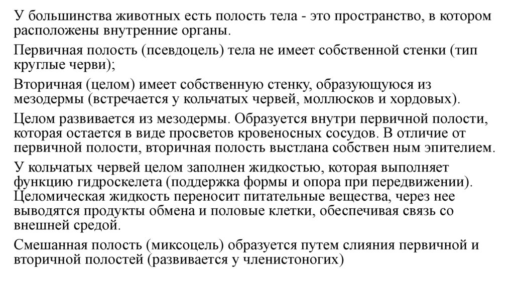У большинства животных есть полость тела - это пространство, в которомрасположены внутренние органы.