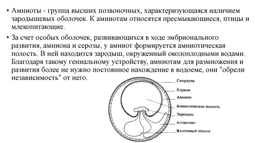 • Амниоты - группа высших позвоночных, характеризующаяся наличиемзародышевых оболочек. К амниотам относятся пресмыкающиеся, птицы и
