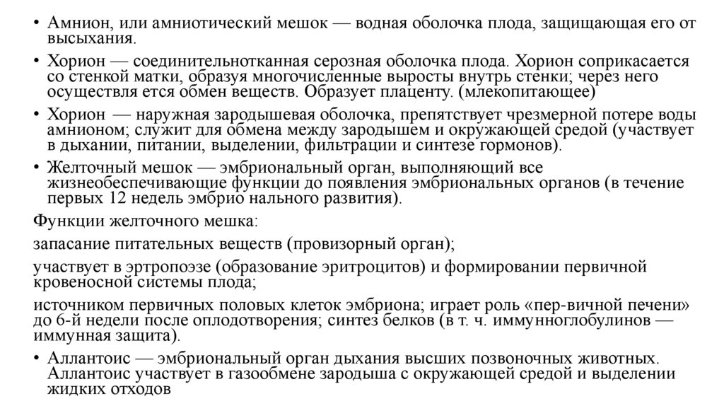 • Амнион, или амниотический мешок — водная оболочка плода, защищающая его отвысыхания.