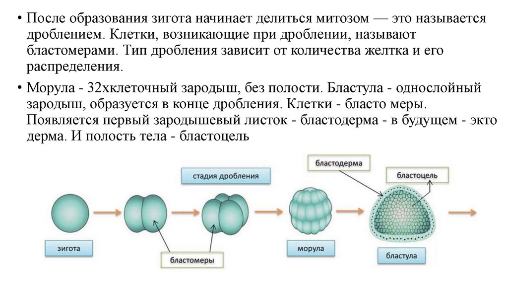 • После образования зигота начинает делиться митозом — это называетсядроблением. Клетки, возникающие при дроблении, называют