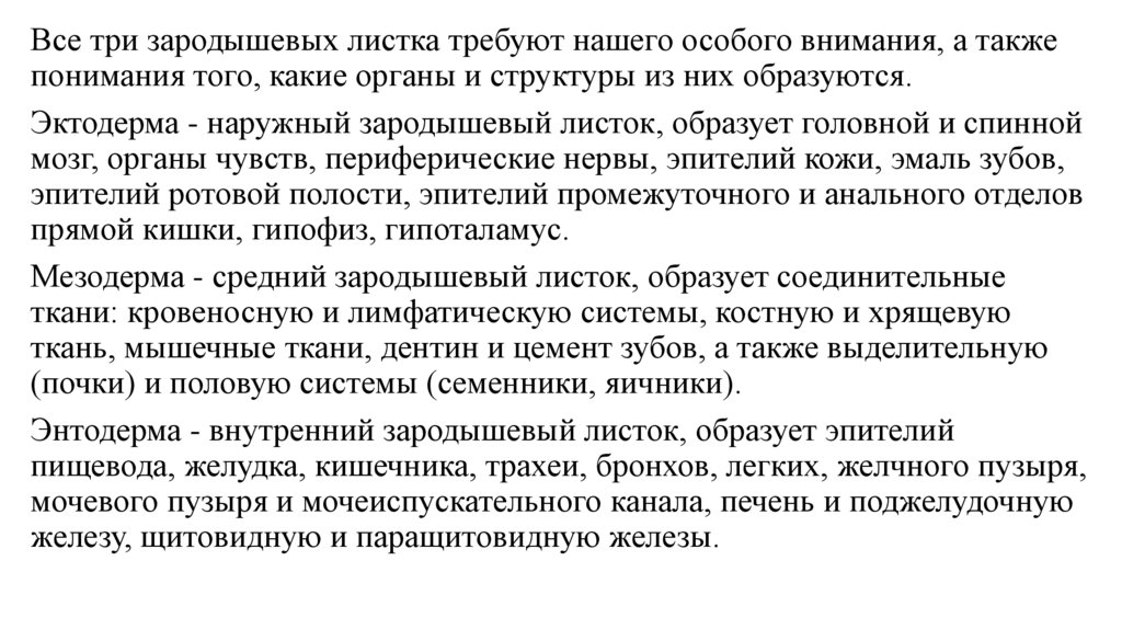 Все три зародышевых листка требуют нашего особого внимания, а такжепонимания того, какие органы и структуры из них образуются.