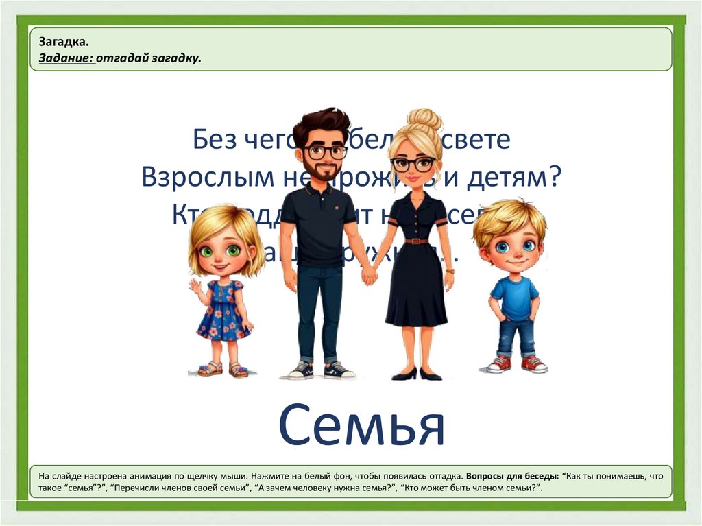 такое “семья”?”, “Перечисли членов своей семьи”, “А зачем человеку нужна семья?”, “Кто может быть членом семьи?”.