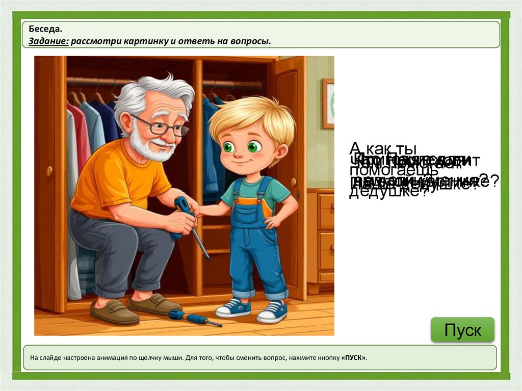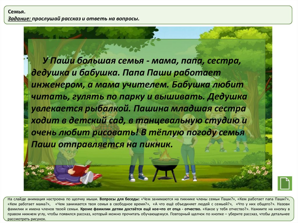На слайде анимация настроена по щелчку мыши. Вопросы для беседы: «Чем занимаются на пикнике члены семьи Паши?», «Кем работает папа Паши?»,