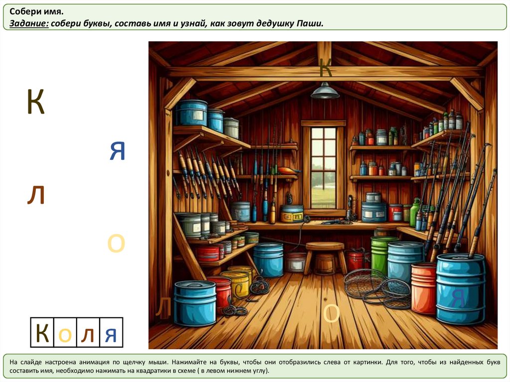 На слайде настроена анимация по щелчку мыши. Нажимайте на буквы, чтобы они отобразились слева от картинки. Для того, чтобы из найденных букв