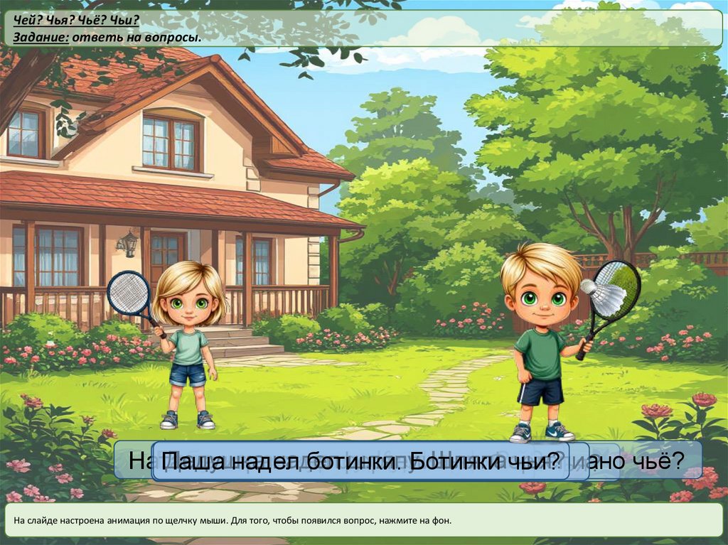 Чей? Чья? Чьё? Чьи?Задание: ответь на вопросы.
