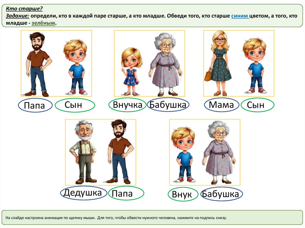 Кто старше?Задание: определи, кто в каждой паре старше, а кто младше. Обведи того, кто старше синим цветом, а того, кто