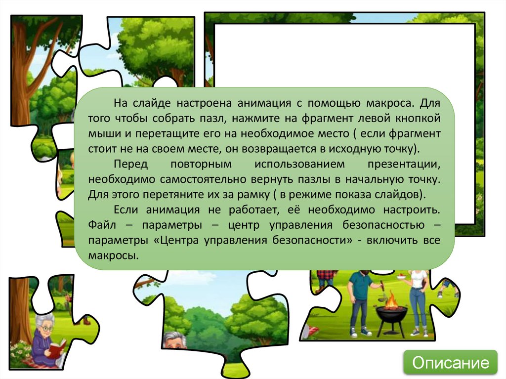 На слайде настроена анимация с помощью макроса. Длятого чтобы собрать пазл, нажмите на фрагмент левой кнопкой