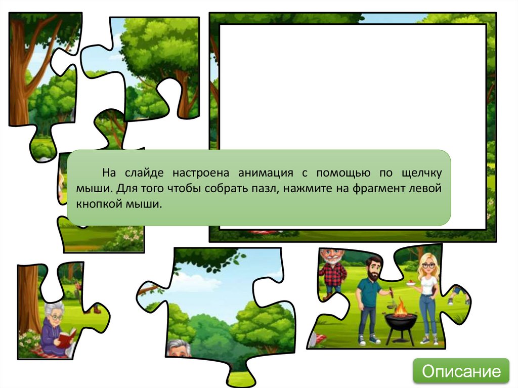 На слайде настроена анимация с помощью по щелчкумыши. Для того чтобы собрать пазл, нажмите на фрагмент левой