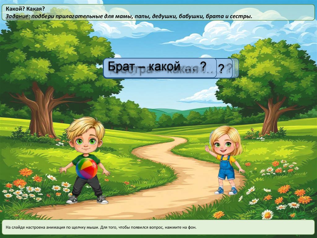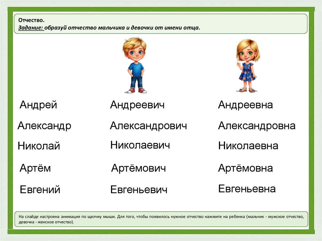 На слайде настроена анимация по щелчку мыши. Для того, чтобы появилось нужное отчество нажмите на ребенка (мальчик - мужское отчество,