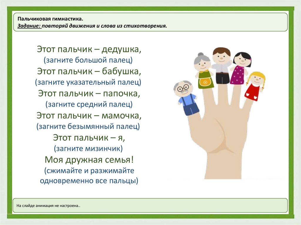 Пальчиковая гимнастика.Задание: повторяй движения и слова из стихотворения.