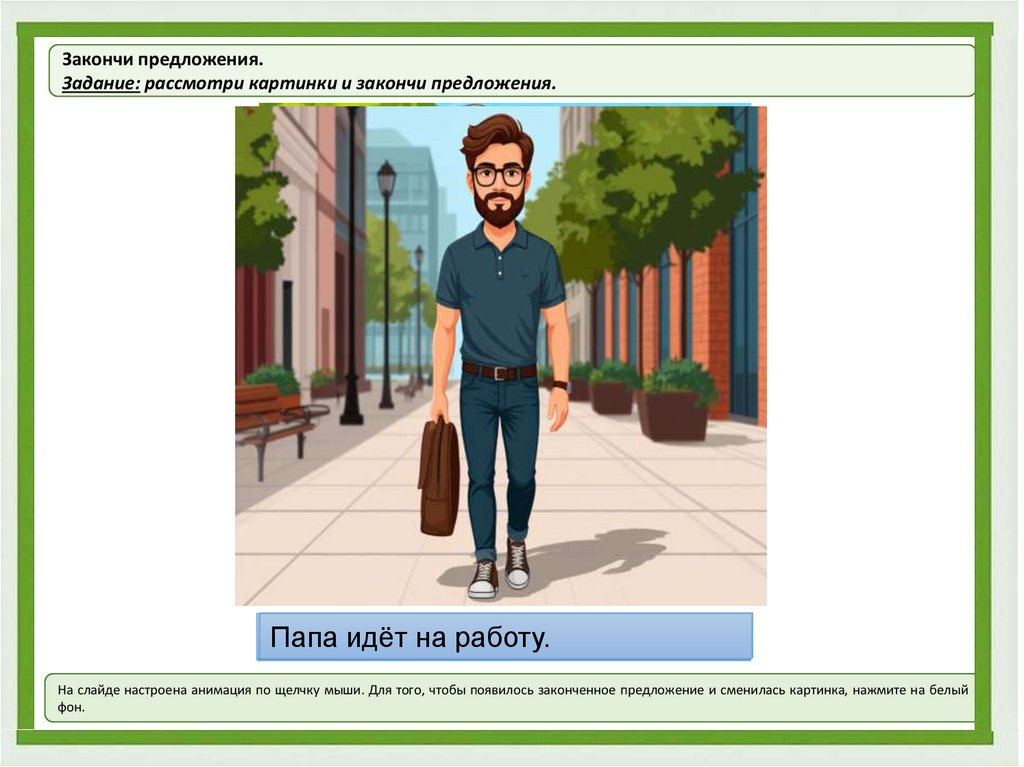 На слайде настроена анимация по щелчку мыши. Для того, чтобы появилось законченное предложение и сменилась картинка, нажмите на белый