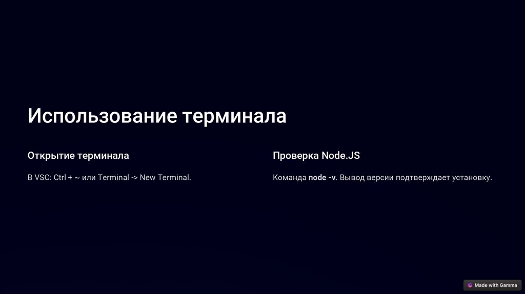 Команда node -v. Вывод версии подтверждает установку.