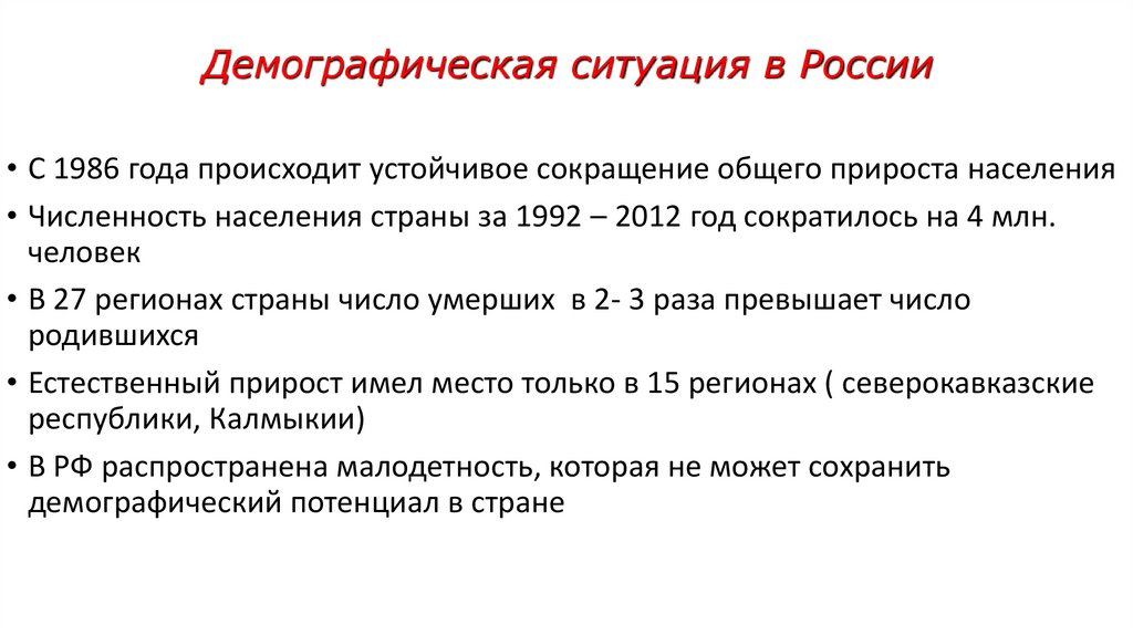 Демографическая ситуация в России• С 1986 года происходит устойчивое сокращение общего прироста населения