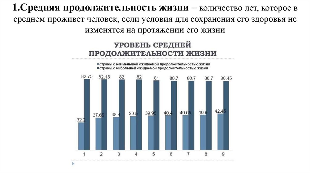 1.Средняя продолжительность жизни – количество лет, которое всреднем проживет человек, если условия для сохранения его здоровья не