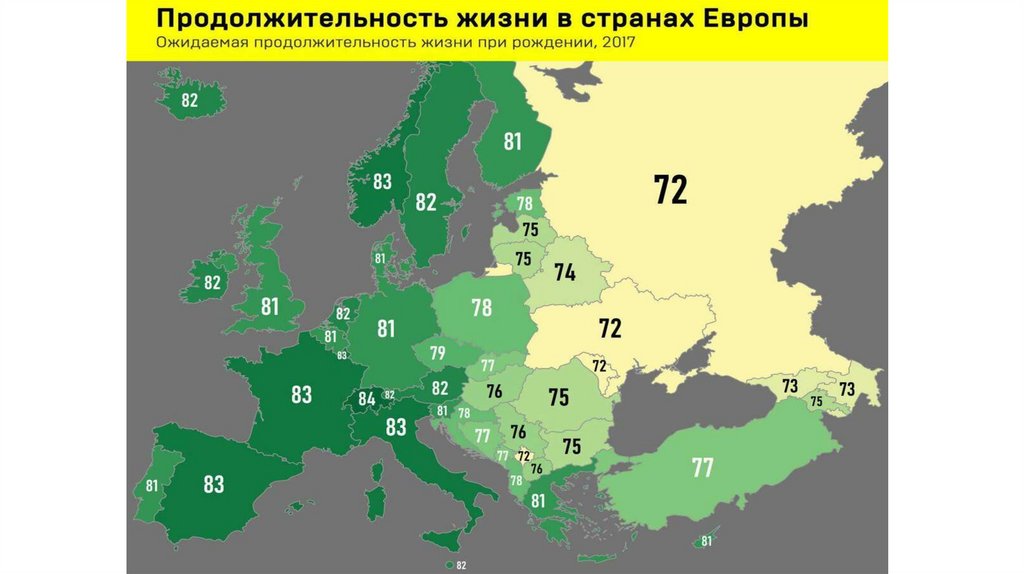 • Максимальная – в Монако – 86,5 год; в Японии – 84,9 лет• Минимальная – в Чаде – 32 года; Лесото – 39 лет