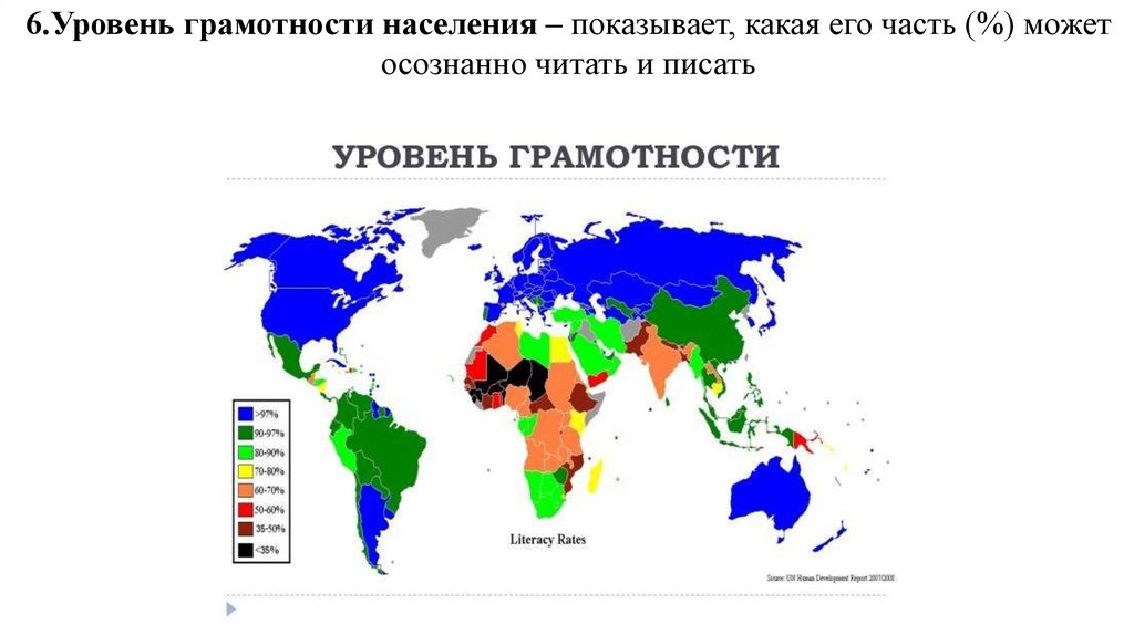 6.Уровень грамотности населения – показывает, какая его часть (%) можетосознанно читать и писать