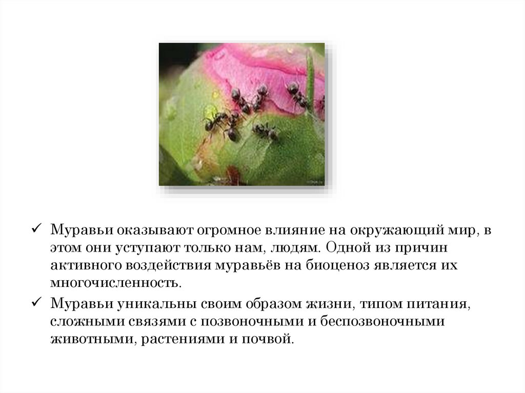 Муравьи оказывают огромное влияние на окружающий мир, вэтом они уступают только нам, людям. Одной из причин