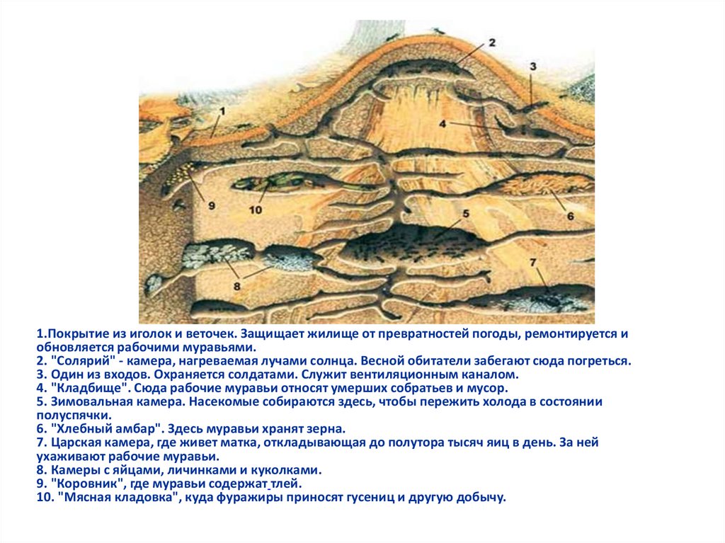 1.Покрытие из иголок и веточек. Защищает жилище от превратностей погоды, ремонтируется иобновляется рабочими муравьями.
