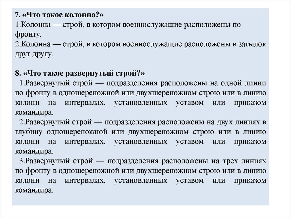 8. Строй — установленное Уставом размещение военнослужащих, подразделений и частей для их совместных действий в пешем порядке и на