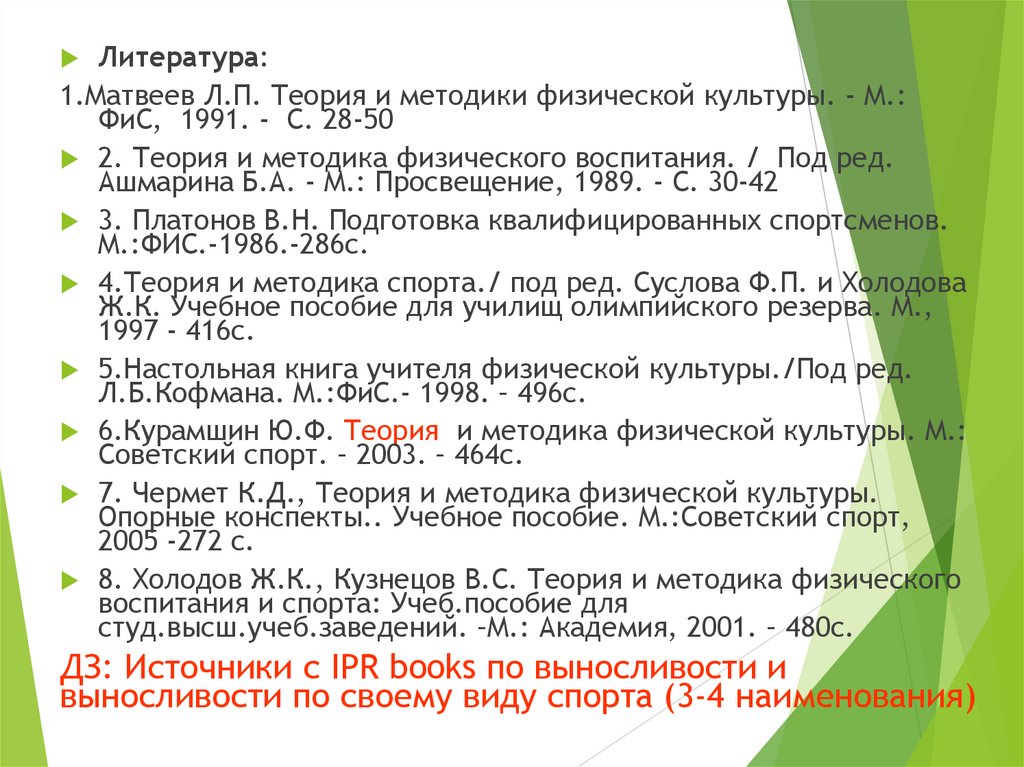 Литература:1.Матвеев Л.П. Теория и методики физической культуры. - М.: