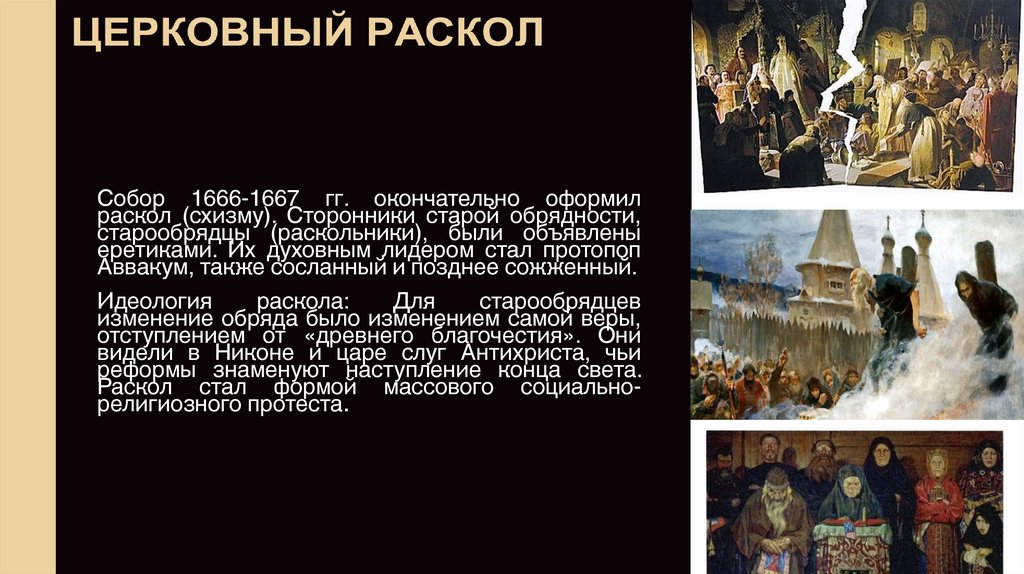 Собор 1666-1667 гг. окончательно оформилраскол (схизму). Сторонники старой обрядности,