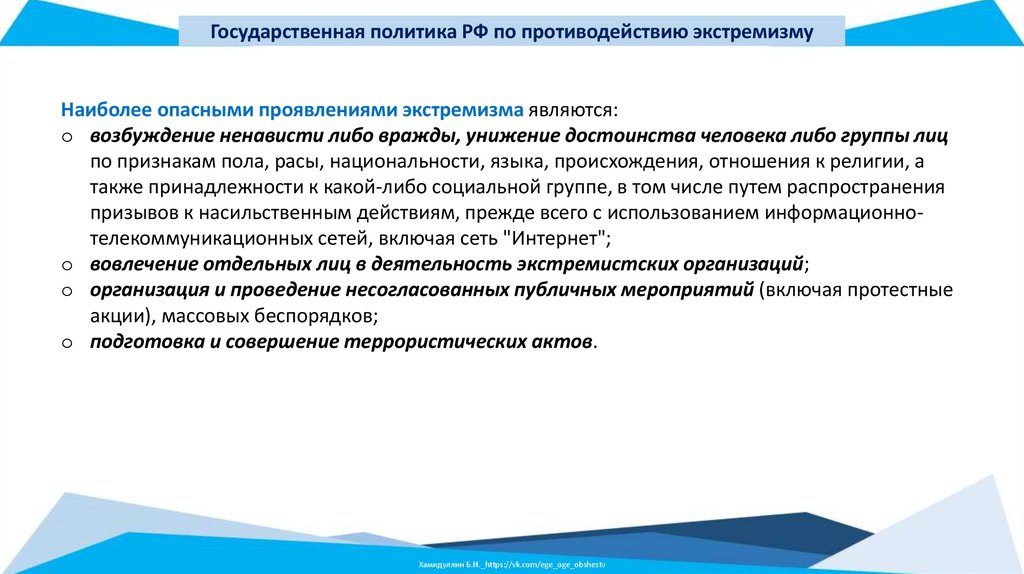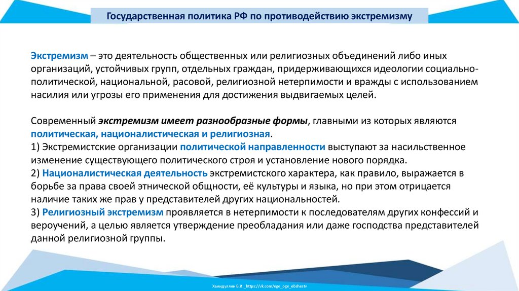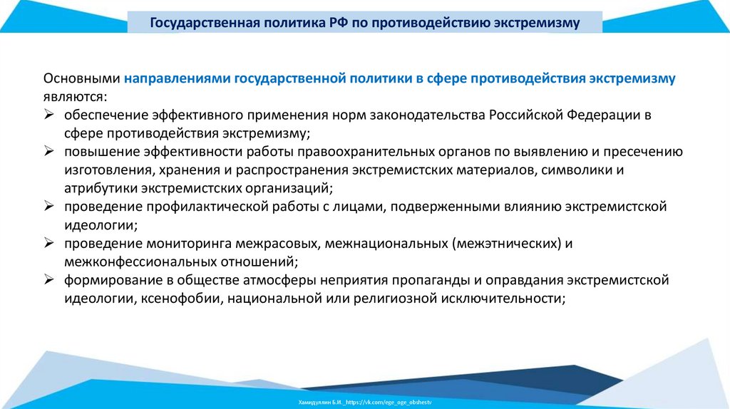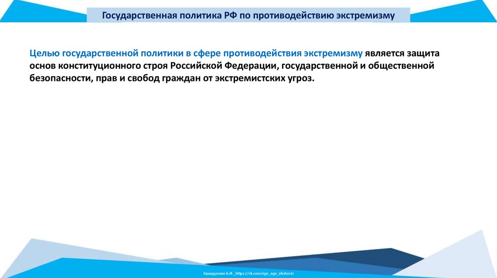 Государственная политика РФ по противодействию экстремизмуЦелью государственной политики в сфере противодействия экстремизму является защита