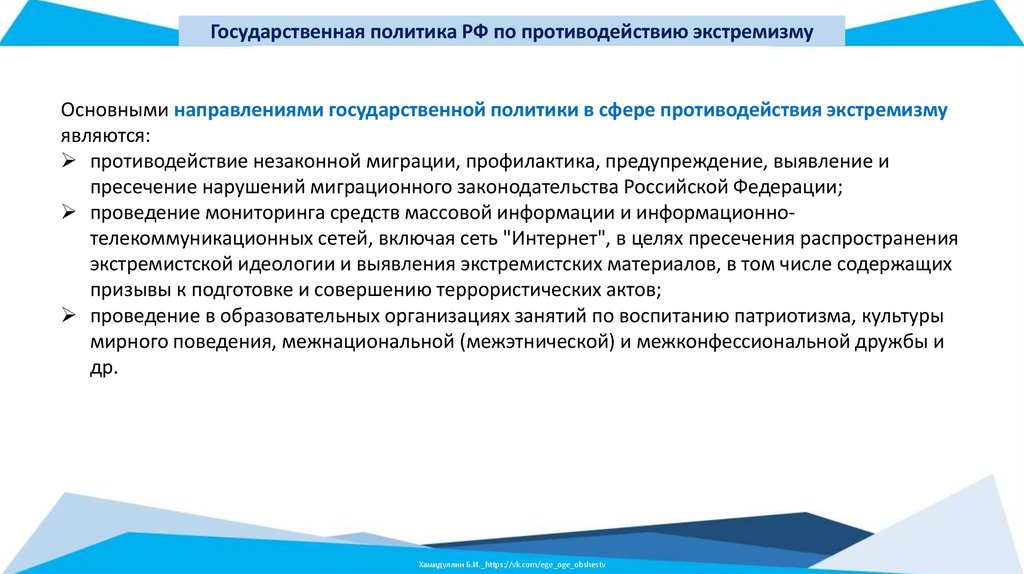 Государственная политика РФ по противодействию экстремизмуОсновными направлениями государственной политики в сфере противодействия экстремизму