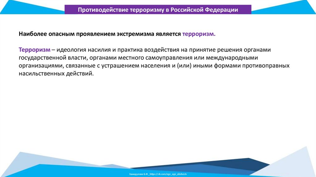 Противодействие терроризму в Российской ФедерацииНаиболее опасным проявлением экстремизма является терроризм.