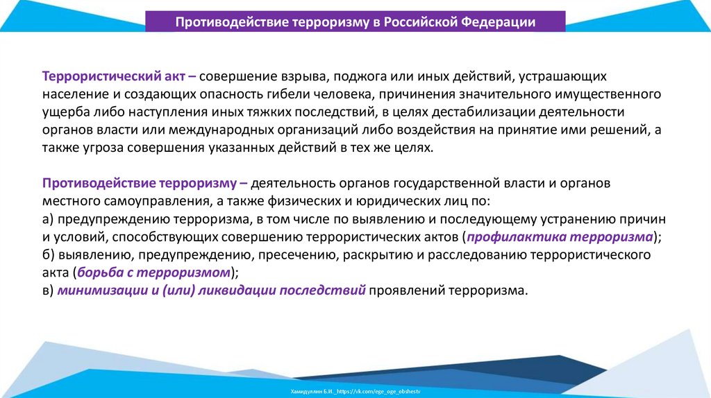 Противодействие терроризму в Российской ФедерацииТеррористический акт – совершение взрыва, поджога или иных действий, устрашающих