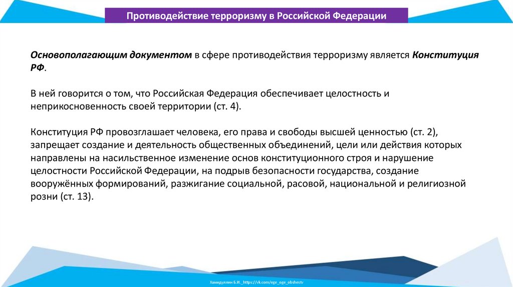 Противодействие терроризму в Российской ФедерацииОсновополагающим документом в сфере противодействия терроризму является Конституция