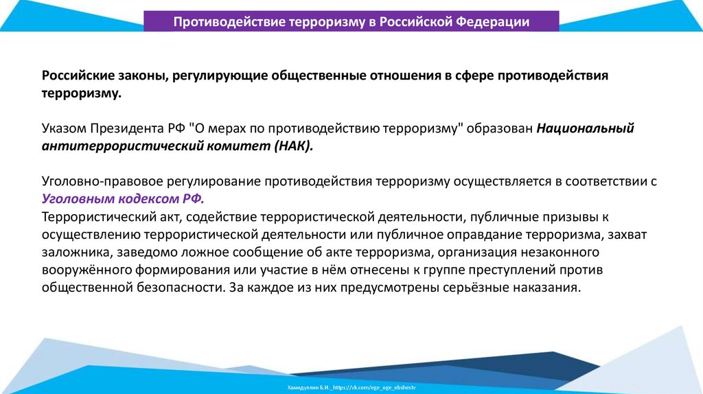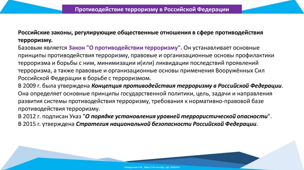 Противодействие терроризму в Российской ФедерацииРоссийские законы, регулирующие общественные отношения в сфере противодействия