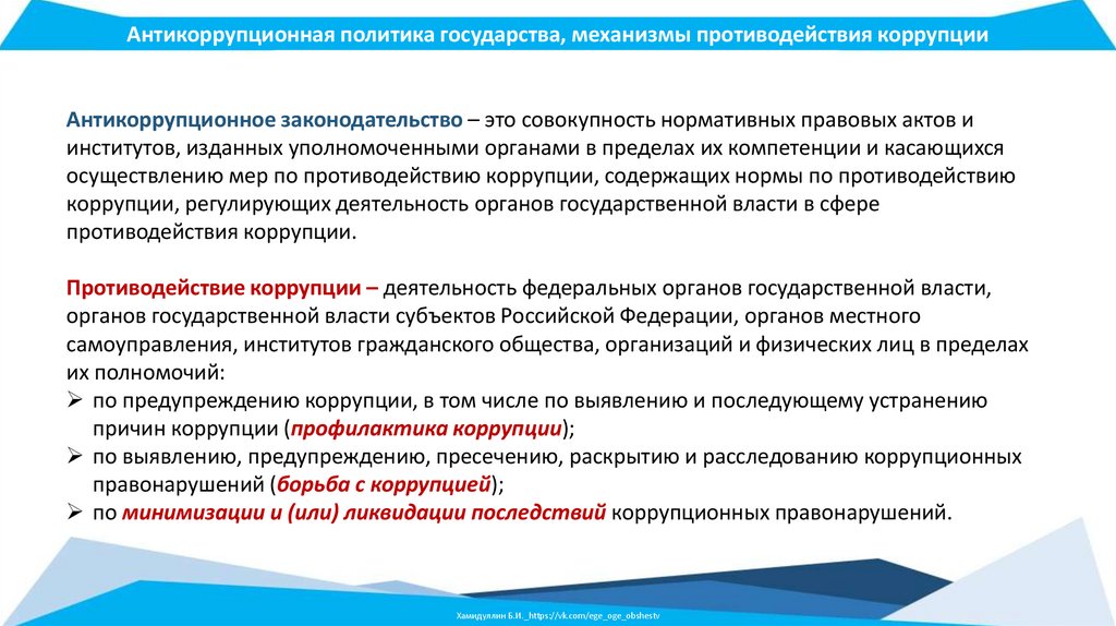 Антикоррупционная политика государства, механизмы противодействия коррупцииАнтикоррупционное законодательство – это совокупность нормативных правовых актов и