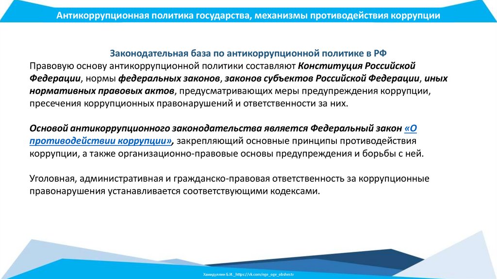 Антикоррупционная политика государства, механизмы противодействия коррупцииЗаконодательная база по антикоррупционной политике в РФ