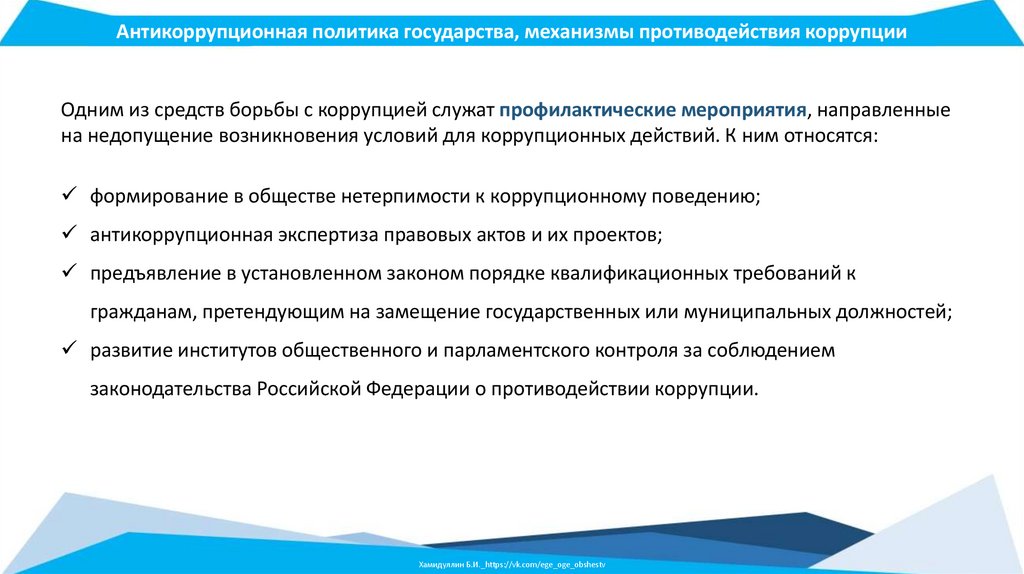 Антикоррупционная политика государства, механизмы противодействия коррупцииОдним из средств борьбы с коррупцией служат профилактические мероприятия, направленные