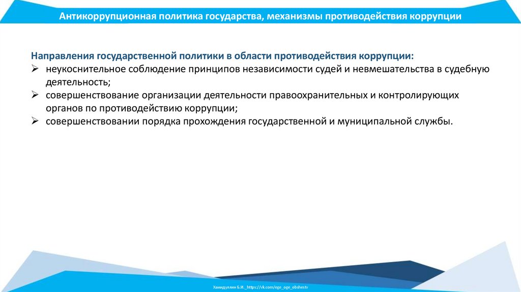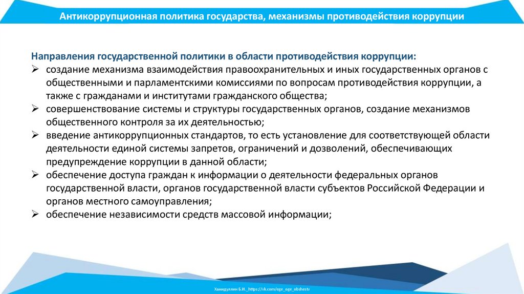 Антикоррупционная политика государства, механизмы противодействия коррупцииНаправления государственной политики в области противодействия коррупции: